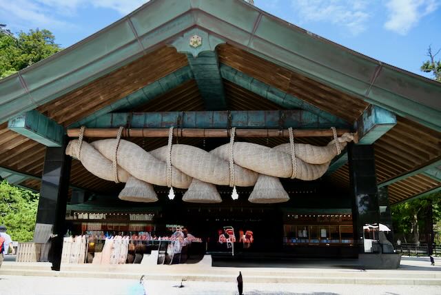 そして会議の会場は出雲大社です。大きいしめ縄で有名な出雲大社ですが、この大きいしめ縄があるのは神楽殿↓↓↓と言う建物で結婚式などに使われています。